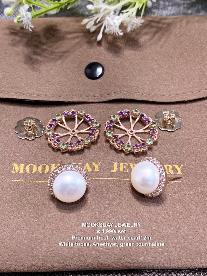 อีกแป้บเดียวก็จะปีใหม่แล้ว ใครที่กำลังหาต่างหูมุกสวยๆวิขอแนะนำคู่นี้ค่า ต่างหูไข่มุกน้ำจืดเกรดพรีเมี่ยม ขนาด12มิล ความเงางาม3AAA+++ สวยะอาดหมดจด ล้อมด้านในด้วยไวท์โทพาส ด้านนอกเป็นอะเมทิสและกรีนทัวร์มาลีน สามารถถอดแจ็กเก็ตออกแยกใส่ได้ด้วย คู่เดียวใส่ได้ทั้งลำลองและออกงาน ตัวเรือนเงินแท้ชุบพิ้งค์โกลด์ แป้นใหญ่ใส่ซัพพอร์ตมุกไม่คว่ำ ลูกค้าใบหูบางก็ใส่สวย ราคา 4,990 บาทสินค้ามีใบรับประกันและบริการหลังการขาย